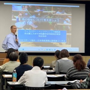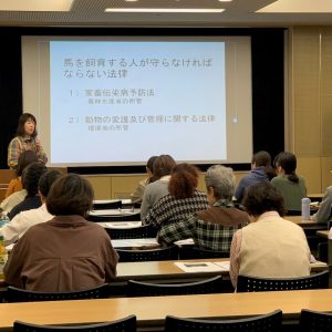 東京農工大学教授の松田教授と田中教授によるセミナーを開催いたしました。馬の福祉について考えましょう・馬の感染症と予防方法と題した内容で開催いたしました。馬に関する法令や馬と人との共生について、馬によく発生する病気や怪我などの対策と処置方法など、非常に勉強になる内容の御話しばかりで、参加者の方々からも開催に関して喜びの声を多くいただきました。また、動物愛護に関して前向きな議員さんも参加していただき良い機会となりました。たっぷりと予定していた質疑応答の時間も、最後は時間が足りなくなるほどでした・・・是非また開催したいと考えております。