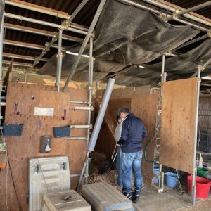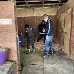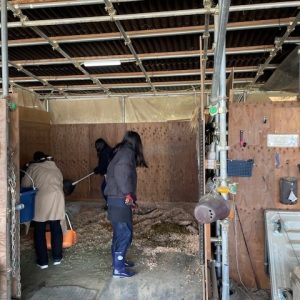②馬房掃除・・・ボロとおしっこを回収して、新しいおが屑を入れてもらいました