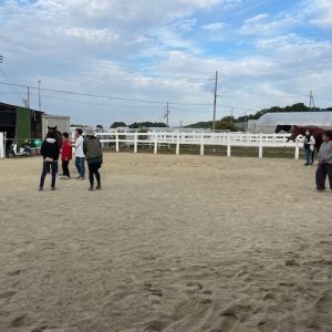 内容は、①座学:馬の基礎知識②えさやり体験③ブラッシング体験④蹄のお掃除体験⑤サラブレッド乗馬体験を体験していただきました。当初は緊張した不陰気で始まりましたが、体験乗馬をする頃にはすっかりと馬にも慣れて、皆さん楽しく参加していただけたと思います。